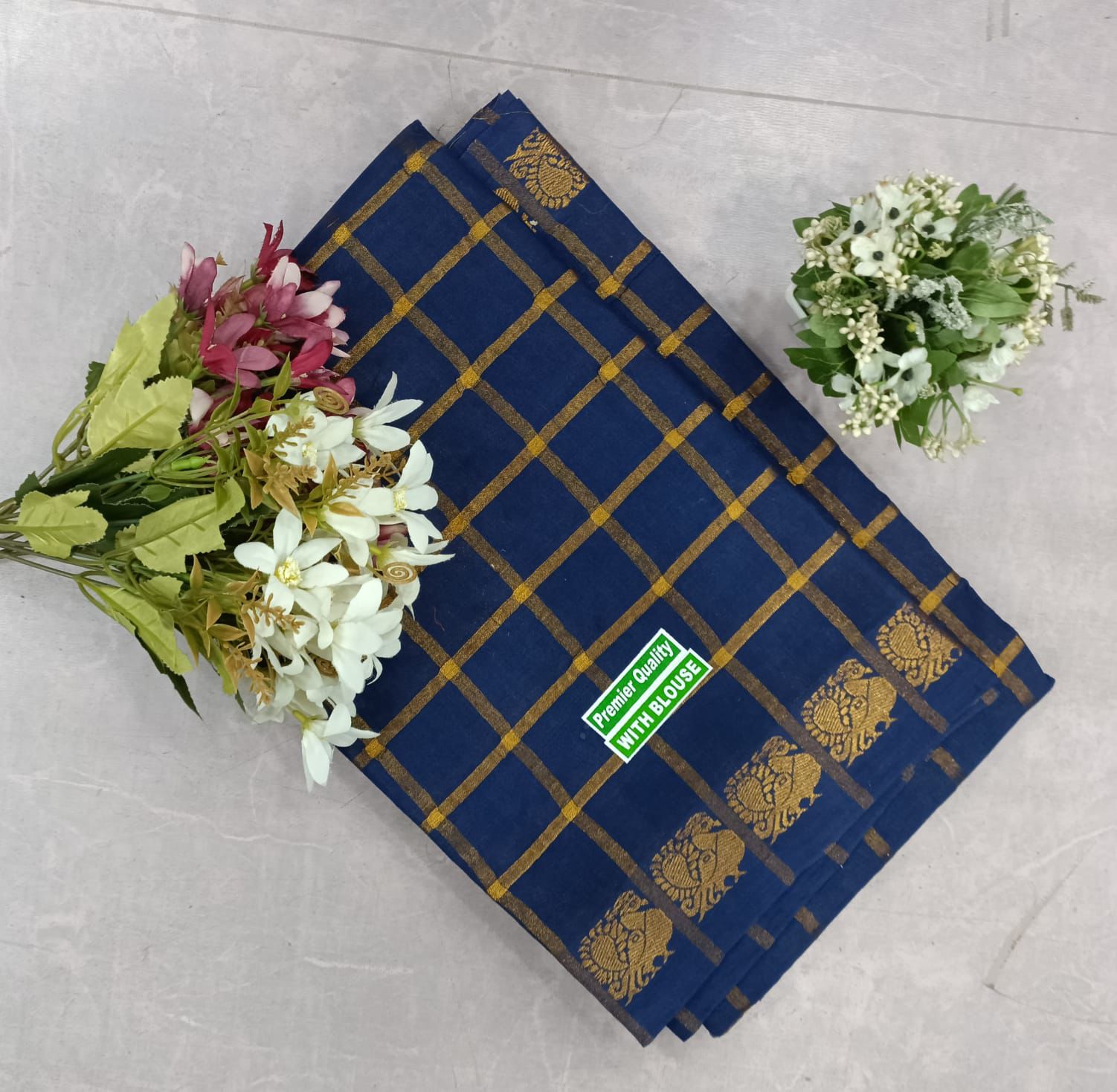 Madurai Sungudi cotton saree in a deep blue color, featuring a classic gold checked (kattam) pattern and a detailed gold zari border.