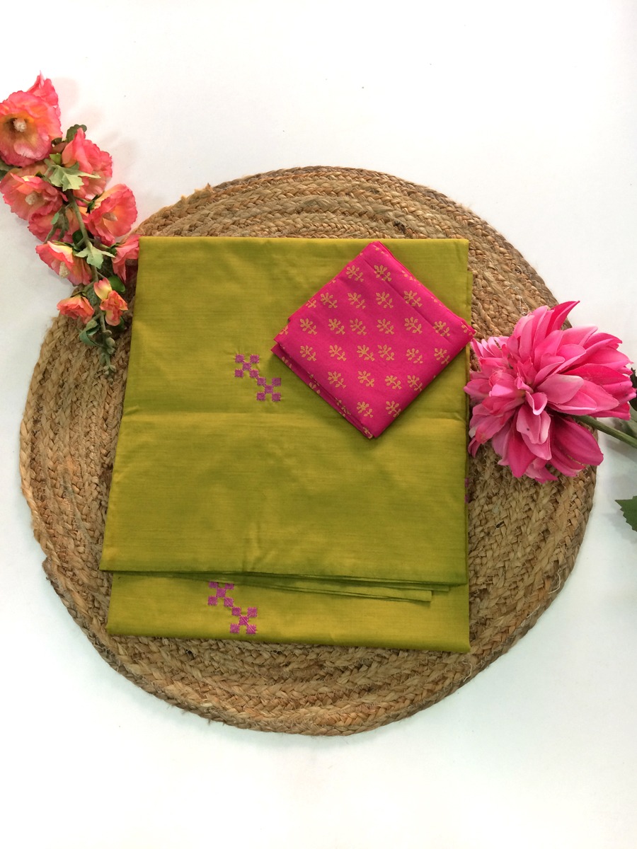 South Cotton Mix Saree (Green with Pink)